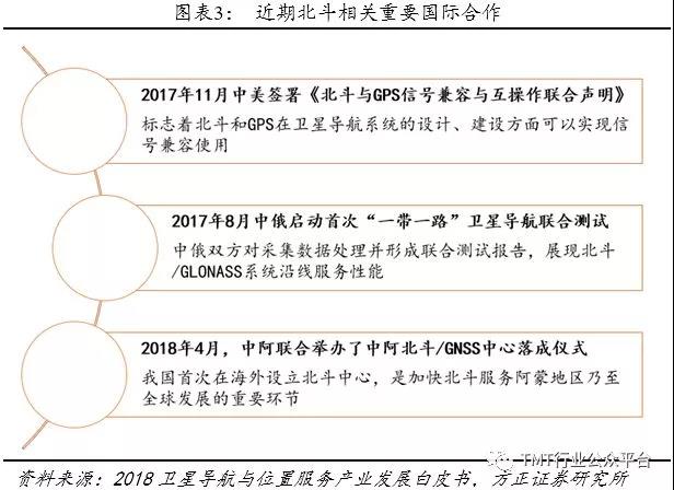 另外,在2012年北斗二号开始向亚太地区提供服务之后,在北斗三号全球组网稳步推进的过程中,国际交流也日益频繁,北斗双边和多边合作成绩斐然。与美国GPS系统和俄罗斯GLONASS系统都已实现信号兼容使用,并与阿拉伯地区展开合作,今年将完成北斗服务于“一带一路”沿线国家。目前,北斗导航系统覆盖了50多个国家、30多亿人口,国产北斗产品输出80多个国家和地区。预计2020年北斗三号组网完成后可以实现全球覆盖。我们认为,在北斗全球覆盖之前与美国GPS、俄罗斯GLONASS系统的兼容合作将有望加速北斗全球产业链的成熟,为之后的北斗全球覆盖打下坚实基础。