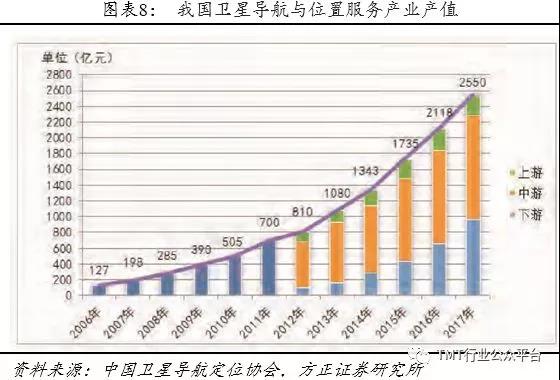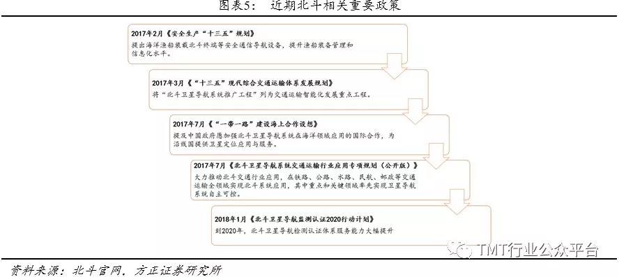 北斗产业及技术同步北斗三号的全球覆盖加速成熟,其中北斗产业从芯片、板卡到系统和运营的整体生态进一步成熟,作为产业核心北斗芯片开始进入28nm,在成本方面已经可逐步媲美GPS芯片,另外北斗三号芯片也已研制成功。随着北斗产业链的快速成熟,北斗定位技术也开始从国防走向行业应用和大众应用。2017年,北斗对包括与卫星导航技术直接相关的芯片、器件、算法、软件、导航数据等在内的产业核心产值贡献率在700亿左右。我们认为,在近年来密集出台的北斗行业应用支持性政策的支持下,北斗将有望在政务、交通、工程基建等方面得到优先应用,同时伴随“一带一路”走出国门,从而打开更加广阔的市场空间。
