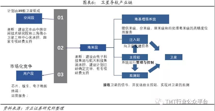 北斗卫星导航产业链可分为五个关键环节:1、卫星制造;2、卫星发射;3、地面设备;4、卫星导航应用;5、下游市场。
