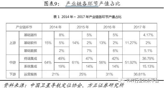 产业链中游产值最大,下游保持快速增长态势。据《2018卫星导航与位置服务产业发展白皮书》,2017年我国卫星导航与位置服务产业总产值达2550亿元,较2016年增长20.4%,其中北斗贡献了超过80%。各环节均有所提升但增速不同,中游和上游受到芯片、板卡、核心器件、终端设备价格下降的影响,产值增速较去年进一步放缓,在全产业链中占比仍然呈现下降趋势。
