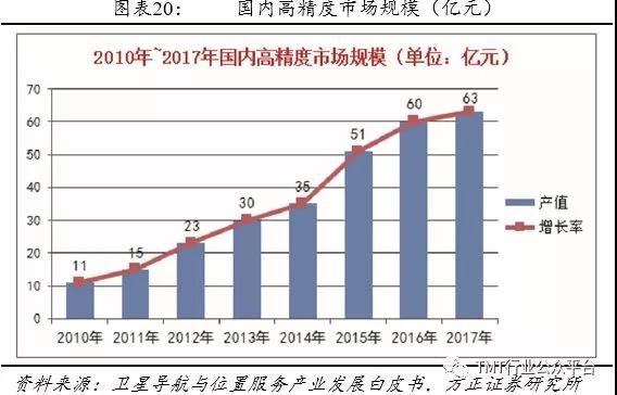 2017年高精度市场持续发展,国内专业高精度接收机终端出货量在14万台(套)左右,国产高精度接收机销量约占50%;高精度天线出货量17.2 万只,其中国内生产的天线超过13万只;高精度相关产品销售收入从2010年的11亿元人民币增长到2017年的近63亿元人民币,复合增长率高达28.4%。