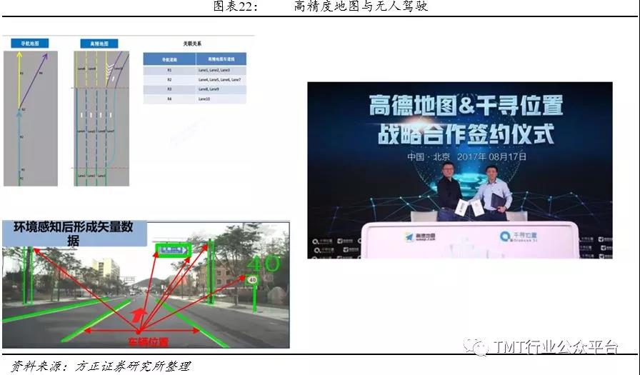 高精电子地图是高精度卫星导航的另一重要应用分支,也是未来无人驾驶技术的稀缺资源和刚需,在整个领域扮演者核心角色,可以帮助汽车预先感知路面复杂信息,如坡度、曲率、航向等,结合智能路径规划,让汽车做出正确决策。“北斗高精地图+5G+人工智能”共同构建了无人驾驶的未来。在传统前装地图领域,目前主要有四维图新(腾讯)、高德(阿里)和易图通(阿里)三家地图供应商,占据 99% 的前装地图市场份额,这三家地图供应商具有各自稳定的整车厂客户群体。