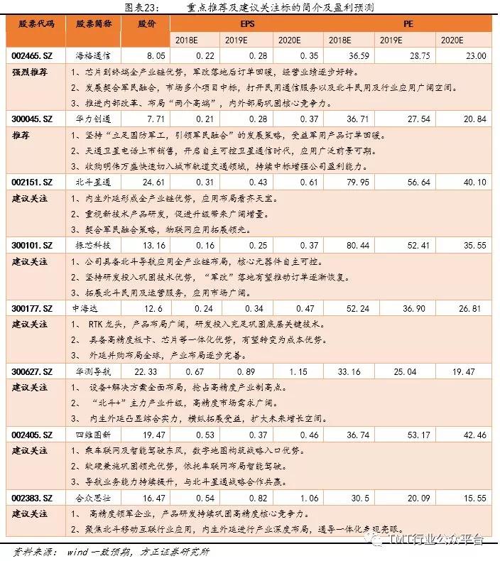 4、投资建议:随着北斗全球化进程稳步推进,北斗产业链在北斗一、二号培育下也在同步成熟。短期军改落地开启国防订单加速恢复,北斗三号有望带来国防装备升级,建议关注:海格通信、振芯科技、华力创通等具备全产业链北斗领先企业。另外,北斗作为高精度PNT技术将在万物互联、无人驾驶、5G等领域占据核心地位,推荐关注:中海达、华测导航、合众思壮等具备高精度研发制造技术的领先企业。
